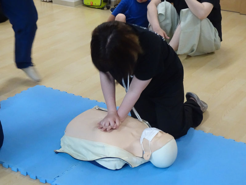今年も「夜間を想定した避難訓練」と「消火器の訓練」と「AEDを用いた心肺蘇生訓練」の3つを“南区川沿出張所の消防士さん”に来ていただき教えてもらいました。