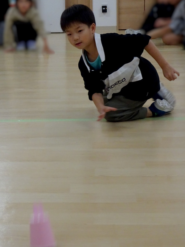 お腹を満たした後は、お月見にちなんだ「お月見カーリング」と「お月見リレー」の2つのゲームを行いました。ホール全体を使ったダイナミックな遊びで、汗をかく子もいるほどの盛り上がり。皆が全力で楽しんでいました。