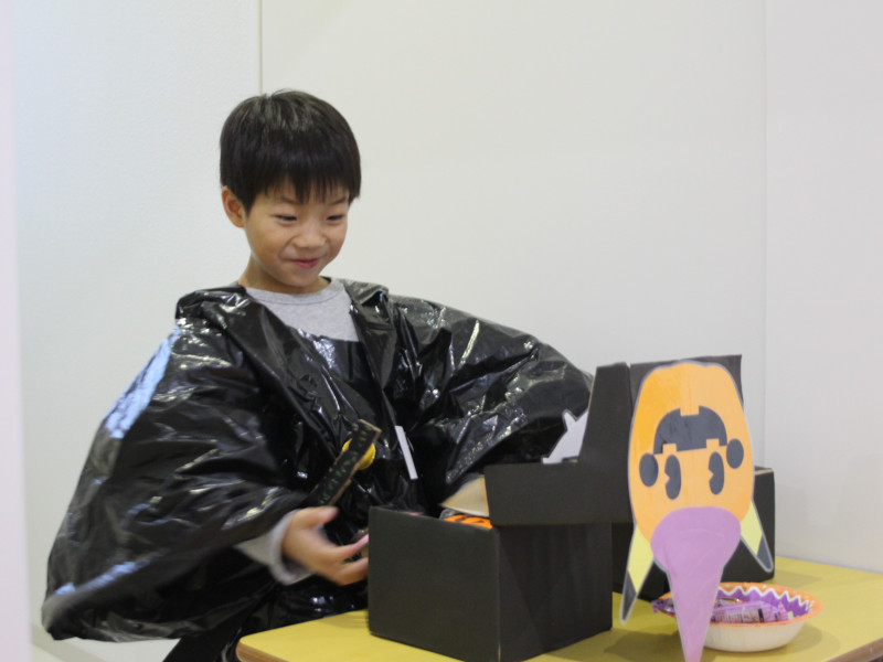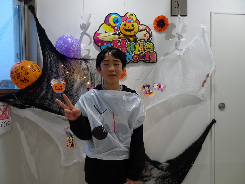 ハロウィンに向けて、子ども達は「鬼滅の刃」や「WIND BREAKER」などの流行中のアニメキャラクター、お化けやドラキュラといった妖怪など、それぞれがなりたい姿の仮装を、カラービニール袋などを使って製作しました。