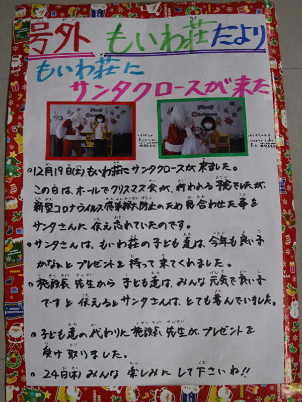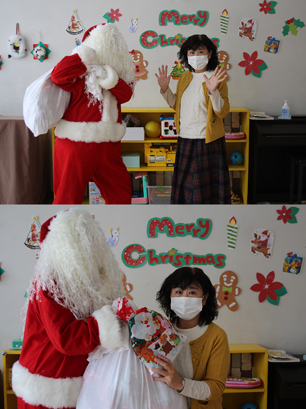 今年はコロナの影響で行事も行えることが少なく施設としても苦しみました。いつもは子どもたちの劇や幼児さんのダンスなど発表があり親子ともに楽しみにしている行事であります。今回は親子で順番にホールに来てもらいクリスマスのプレゼントを渡しました。降りて来るときにサンタさんの格好をして降りて来る子もおりそれを見て職員もクリスマスを実感して心が癒されました。また、いつも日ごろ頑張っている母にもプレゼントを用意してお渡ししました。すると素敵な笑顔で喜んでくれて子どもたちも嬉しそうにしておりました。
