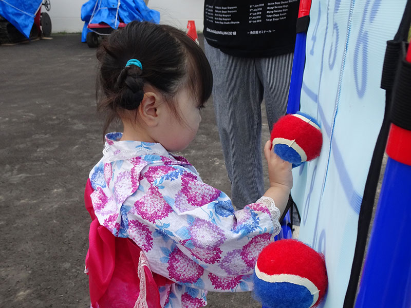 子ども達は、団子に見立てた玉をうさぎの口を目掛けて全力で投げ入れました。