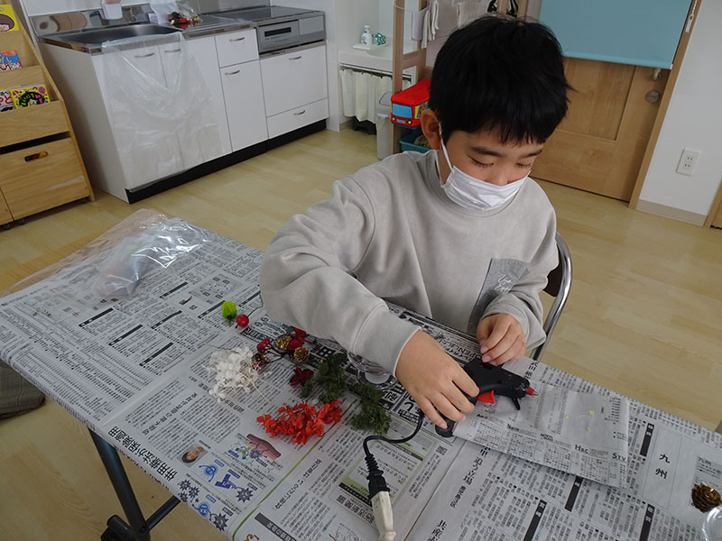 製作は、悩みながら飾りを配置する子、どんどん飾りを張り付けていく子など進め方は様々でしたが皆無事完成させることができました。綺麗で素晴らしいものを作ることができ、皆楽しそうでした。
