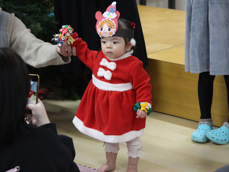 幼児さんは「アンパンマンのサンサンたいそう」と「ジングルベル」に合わせたダンスをしました。帰宅後などのわずかなタイミングで何度か練習を重ね、本番では先生の見本を見ながら皆が上手に踊ることができました。