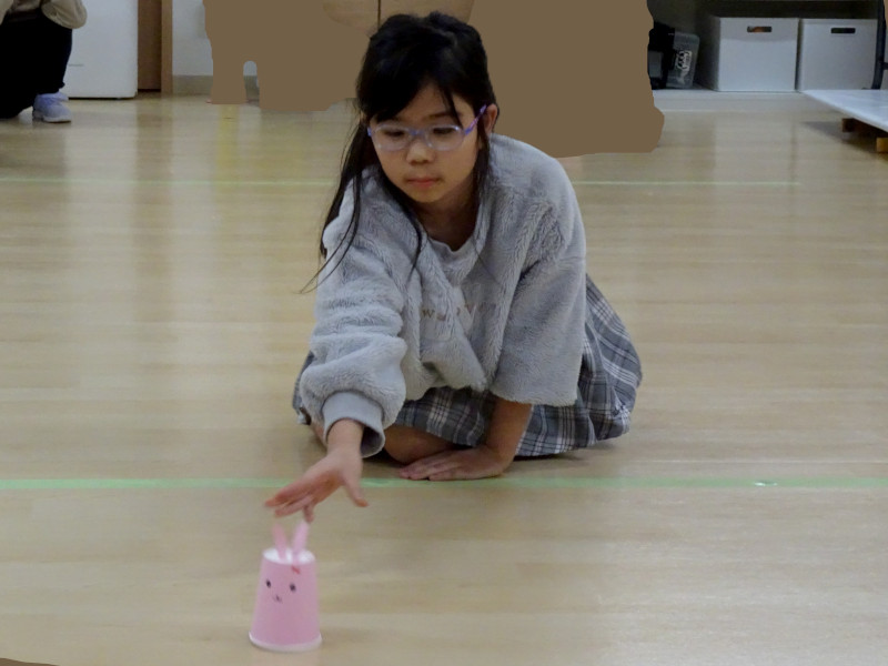 お腹を満たした後は、お月見にちなんだ「お月見カーリング」と「お月見リレー」の2つのゲームを行いました。ホール全体を使ったダイナミックな遊びで、汗をかく子もいるほどの盛り上がり。皆が全力で楽しんでいました。