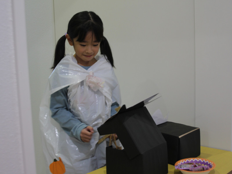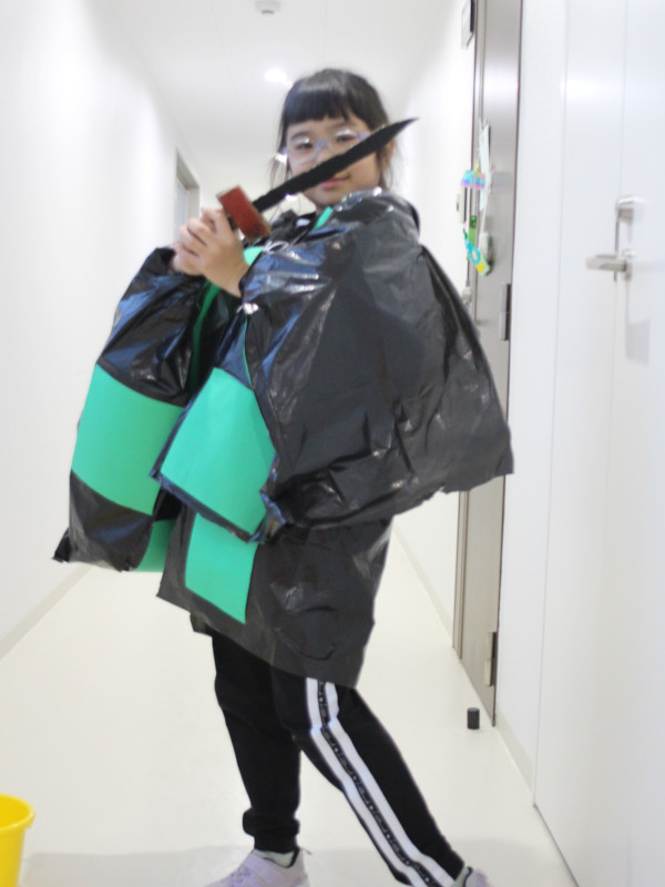 ハロウィンに向けて、子ども達は「鬼滅の刃」や「WIND BREAKER」などの流行中のアニメキャラクター、お化けやドラキュラといった妖怪など、それぞれがなりたい姿の仮装を、カラービニール袋などを使って製作しました。